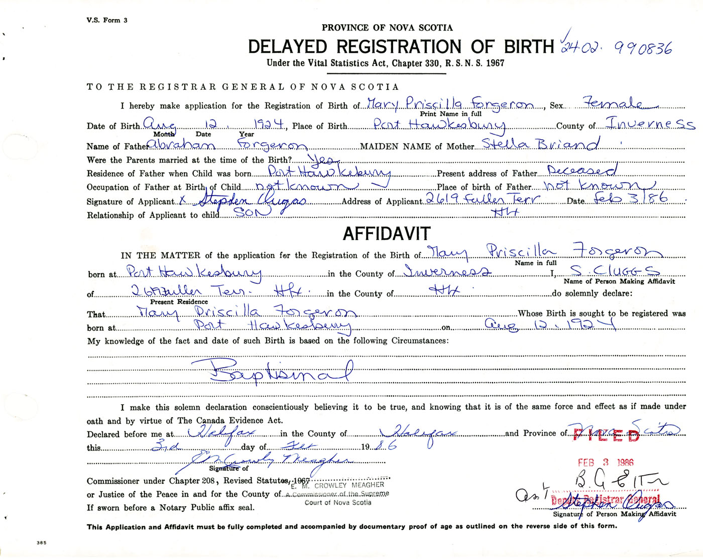IN THE MATTER of the application for the Registration of the Birth of Mary PriscillaForgeron