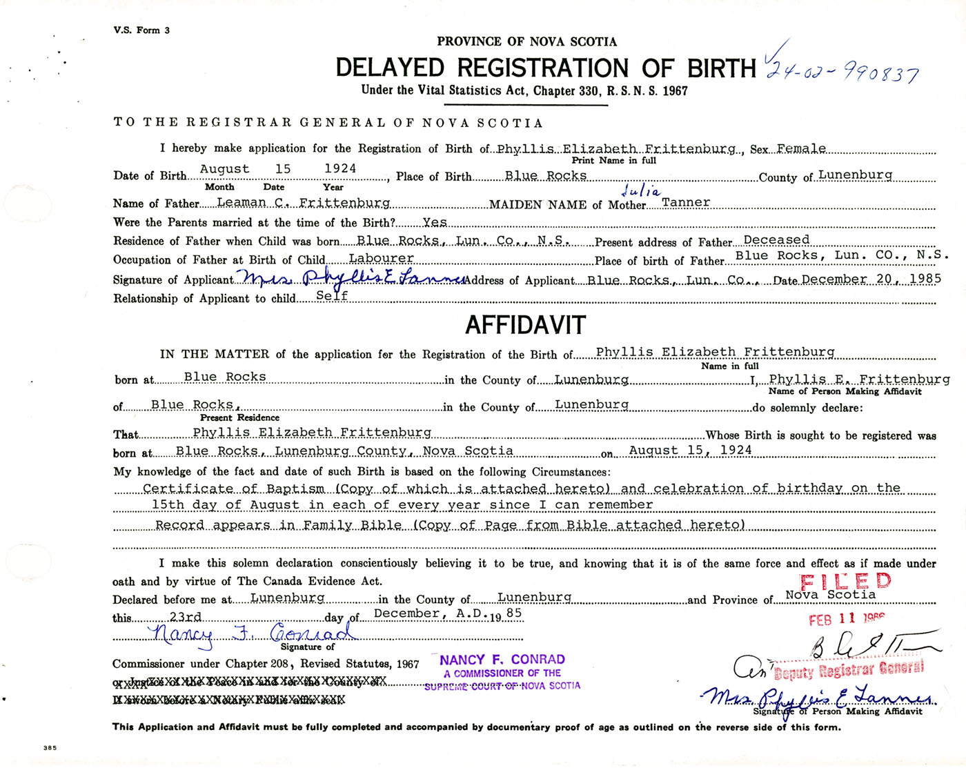 IN THE MATTER of the application for the Registration of the Birth of Phyllis ElizabethFrittenburg