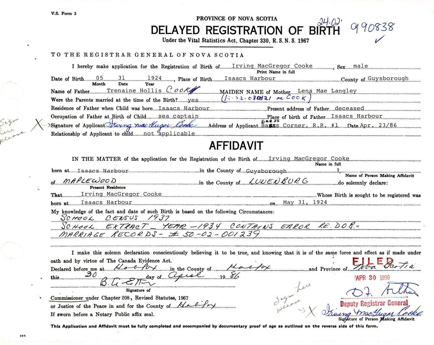 Signature of Applicant Irving MacGregor Cooke Address of Applicant Barss Corner Date April 23, 1986