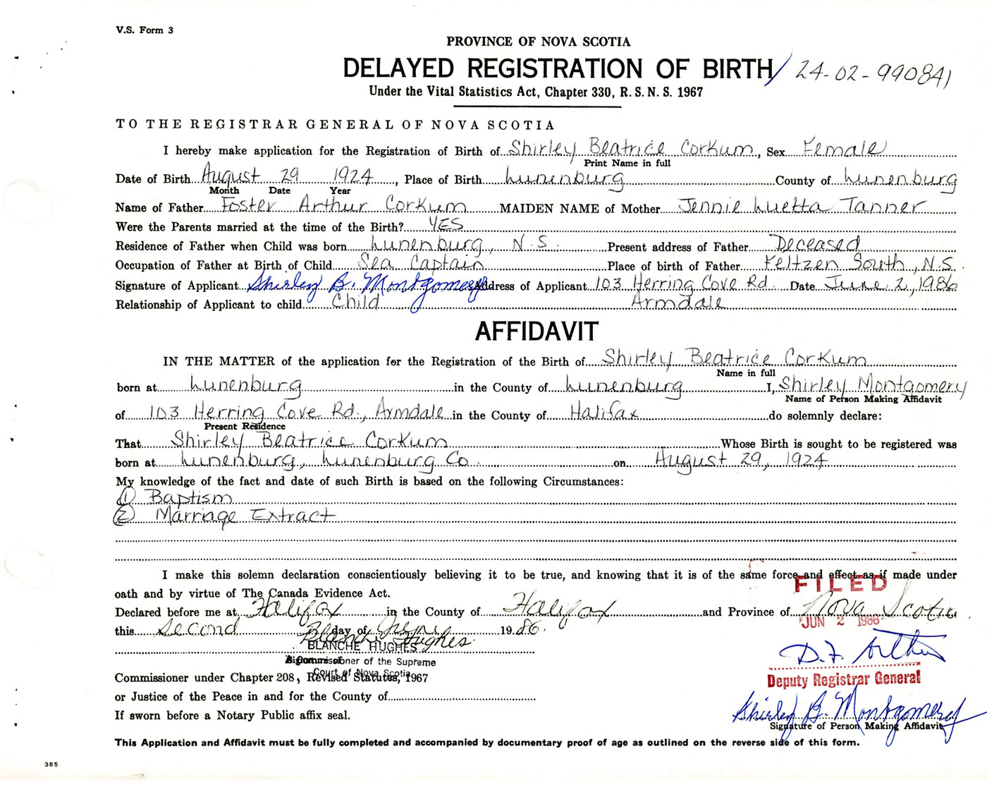 I hereby make application for the Registration of Birth of Shirley BeatriceCorkum Sex Female