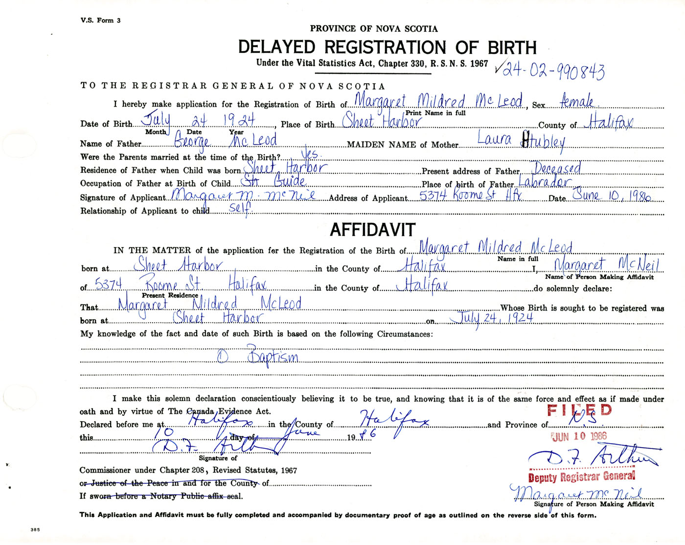 born at Sheet Harbour Halifax County on July 24, 1924