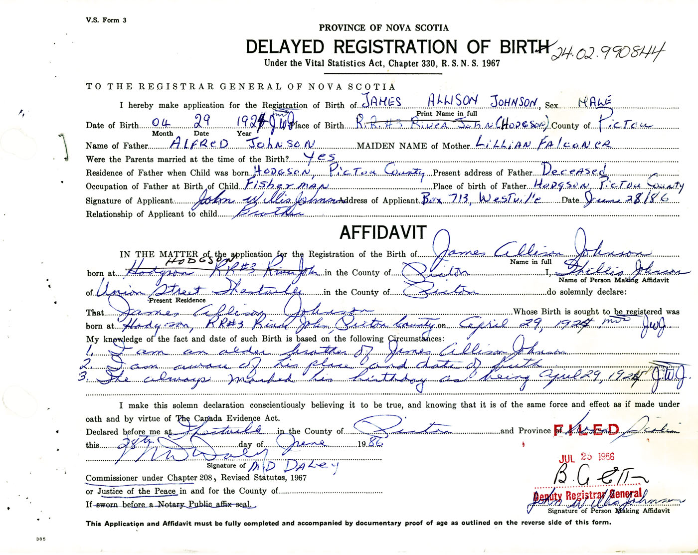 IN THE MATTER of the application for the Registration of the Birth of James AllisonJohnson