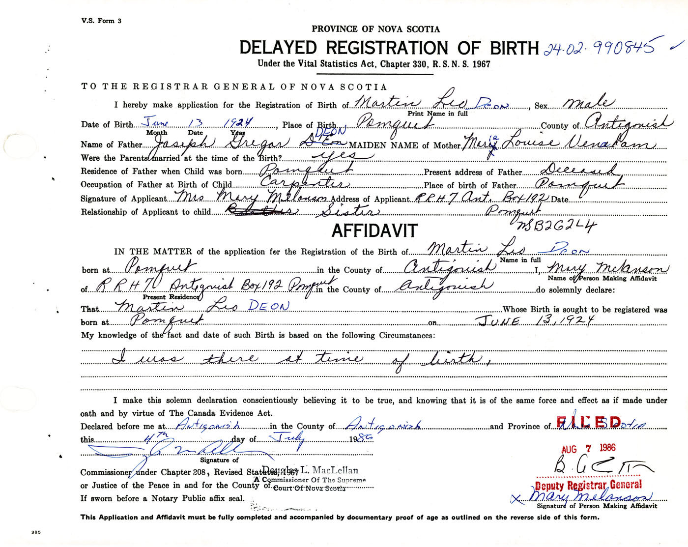 Signature of Applicant Mrs. Mary Melanson Address of Applicant Pomquet Date 4 July 1986