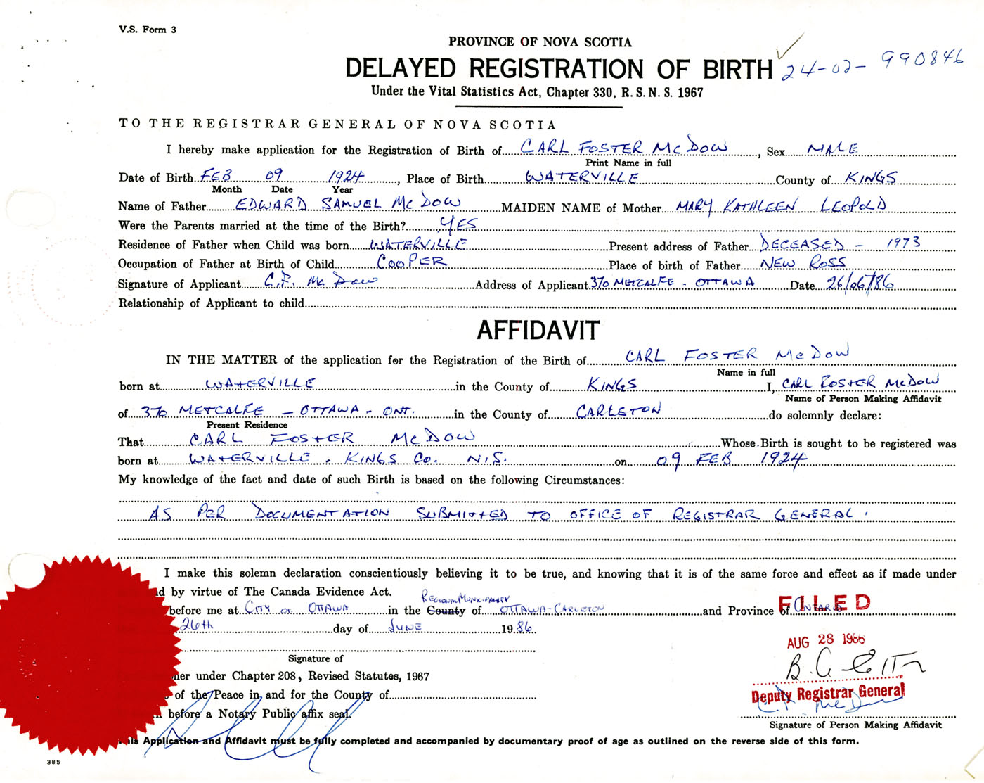 Male Birth Registration: Year: 1924 number: 99000846