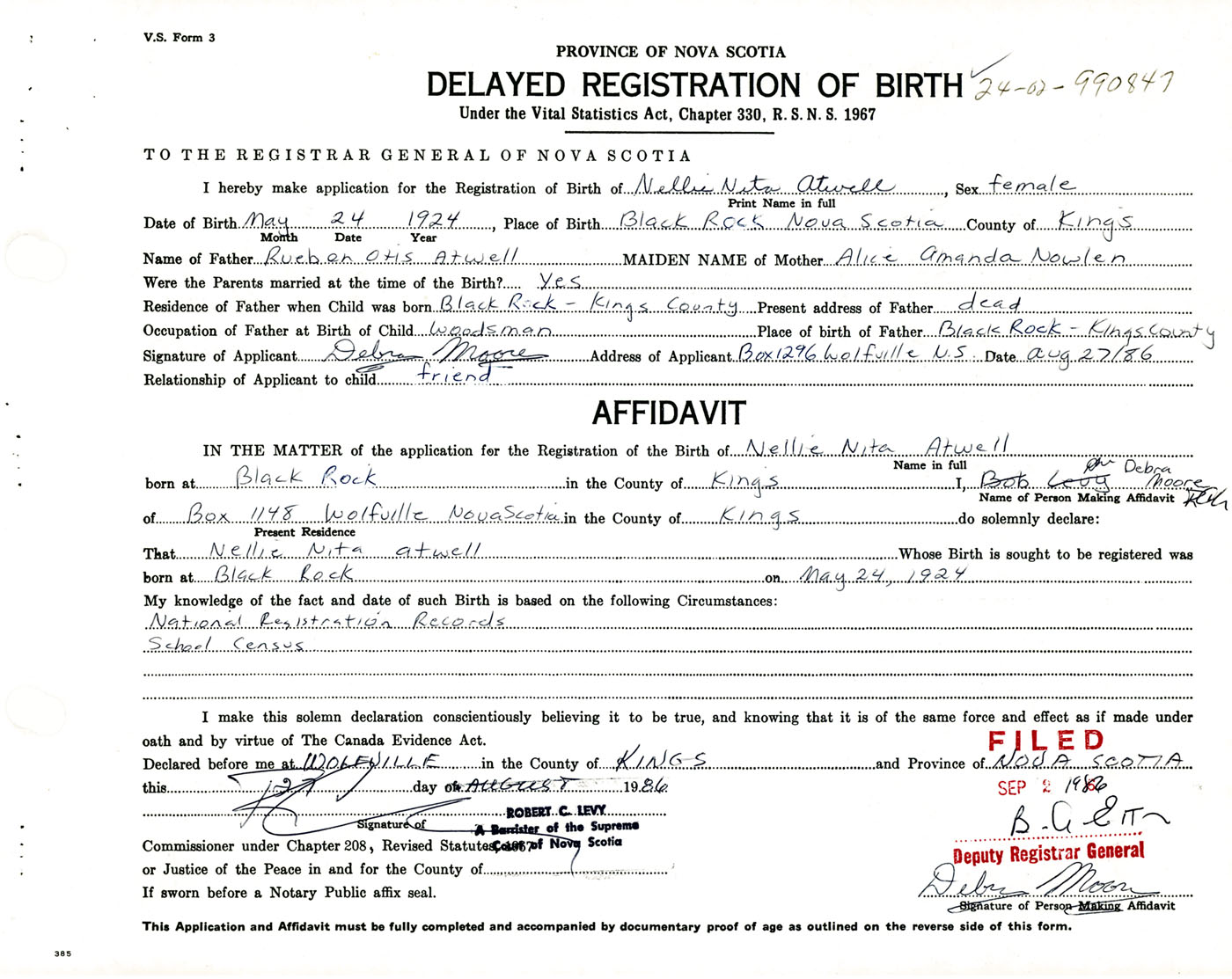 Signature of Applicant Debra Moore Address of Applicant Wolfville Date August 27, 1986