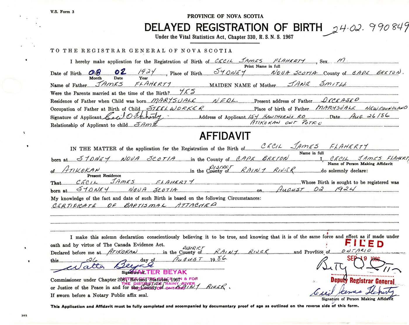 Signature of Applicant Cecil Flaherty Address of Applicant Atikokan, Ontario Date August 26, 1986