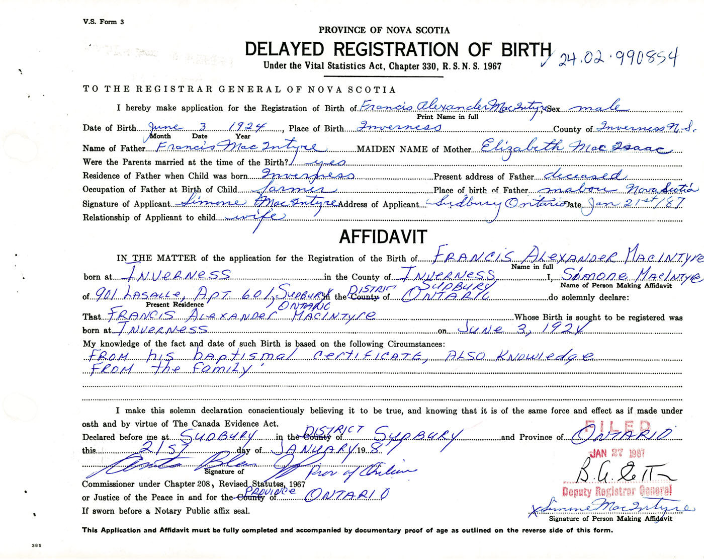 IN THE MATTER of the application for the Registration of the Birth of Francis AlexanderMacIntyre