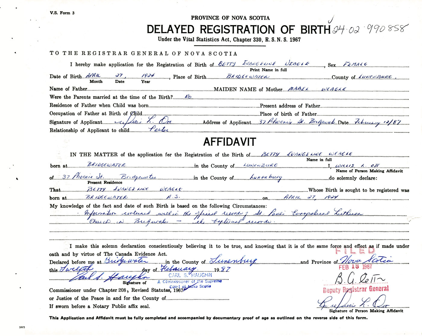 I hereby make application for the Registration of Birth of Betty EvangelineWeagle Sex Female