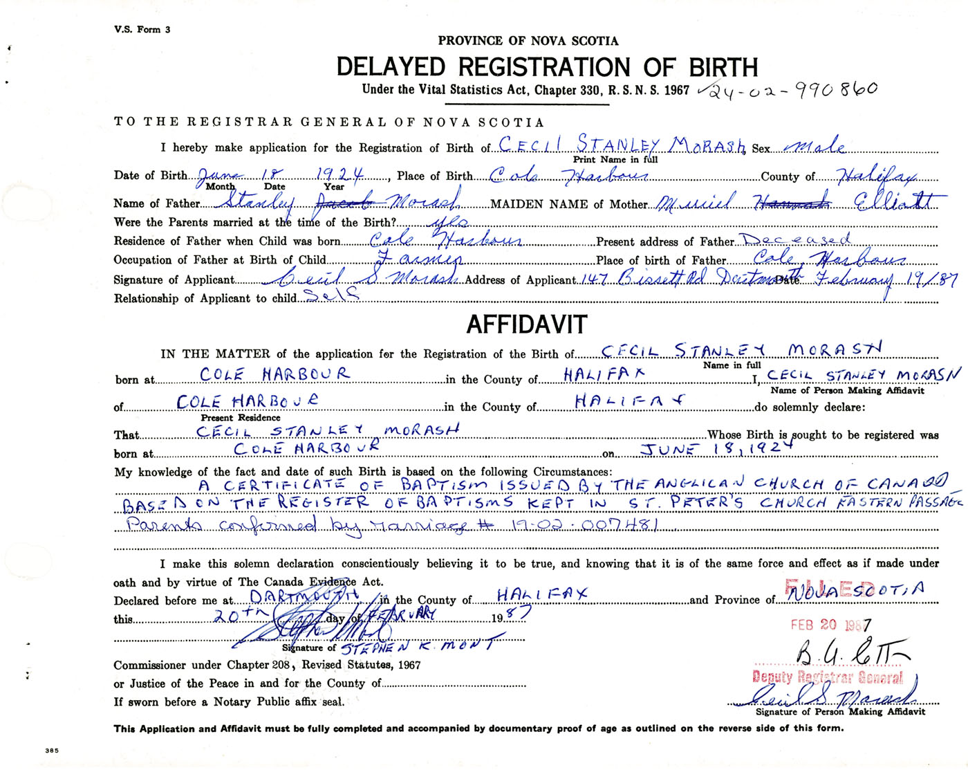 Date of Birth June 18, 1924 Place of Birth Cole HarbourCounty of Halifax
