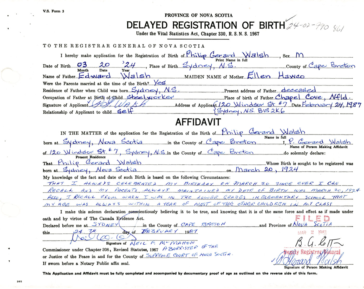 Signature of Applicant P.G. Walsh Address of Applicant 120 Windsor St. Sydney Date February 24, 1987