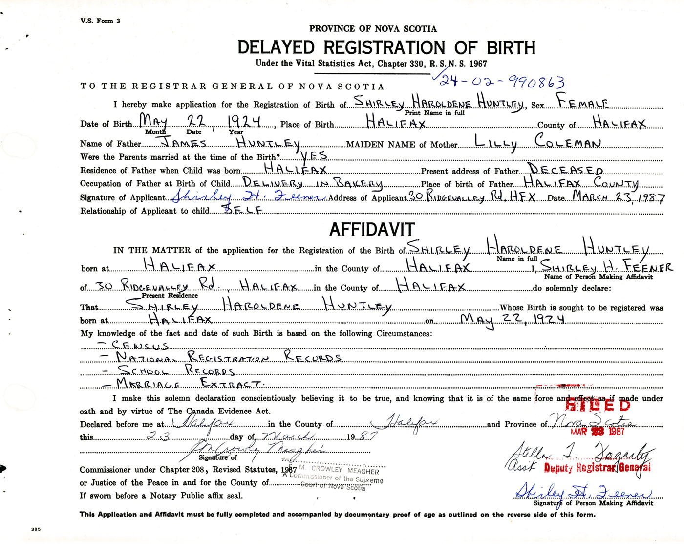 I hereby make application for the Registration of Birth of Shirley HaroldeneHuntley Sex Female