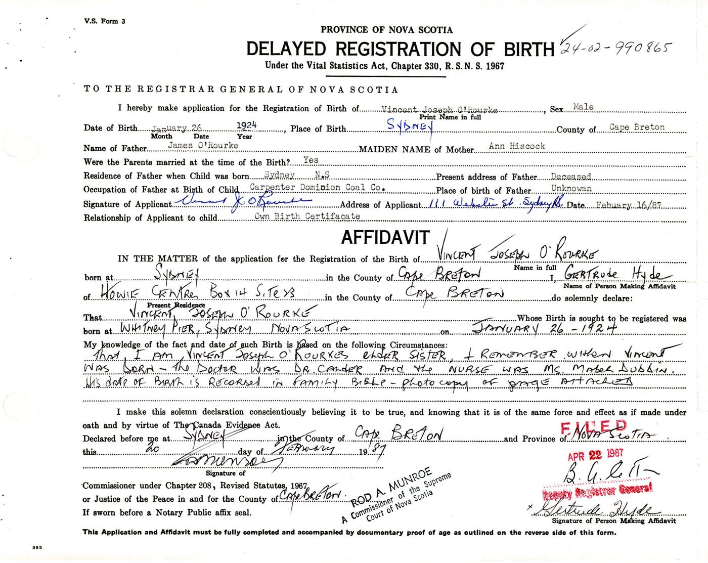 That I am Vincent Joseph O'Rourke's older sister, I remember when Vincent was born - The Doctor was Dr. Calder and the nurse was Ms. Mabel Dubbin. His date of birth is recorded in Family Bible - photocopy of page attached