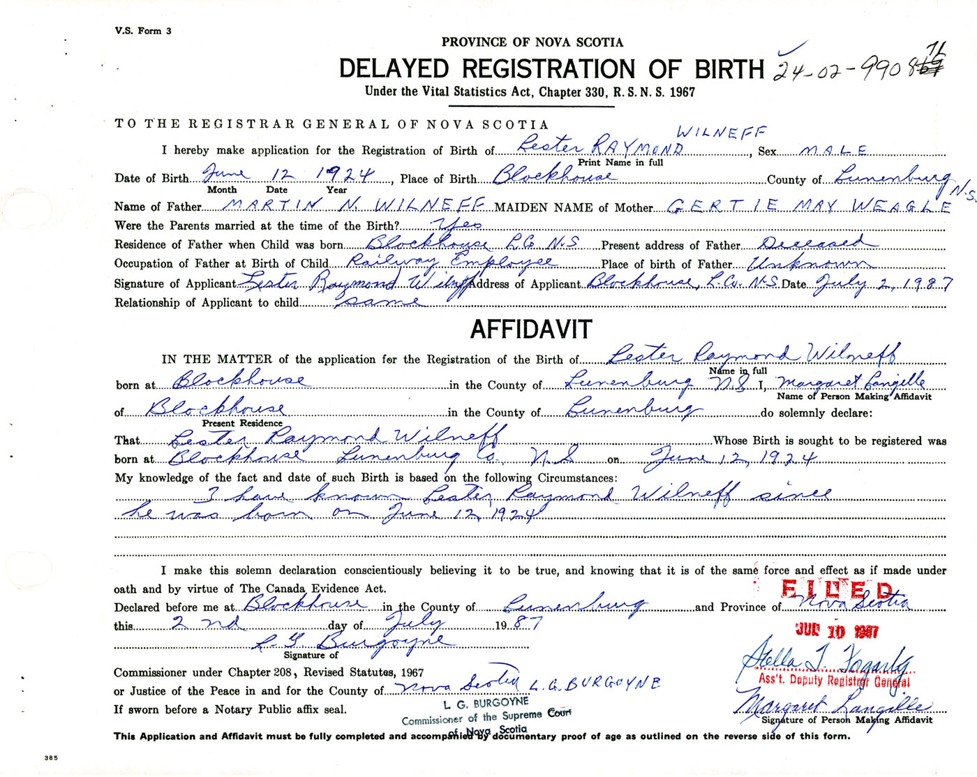 Signature of Applicant Lester Raymond Wilneff Address of Applicant Blockhouse Date July 2, 1987