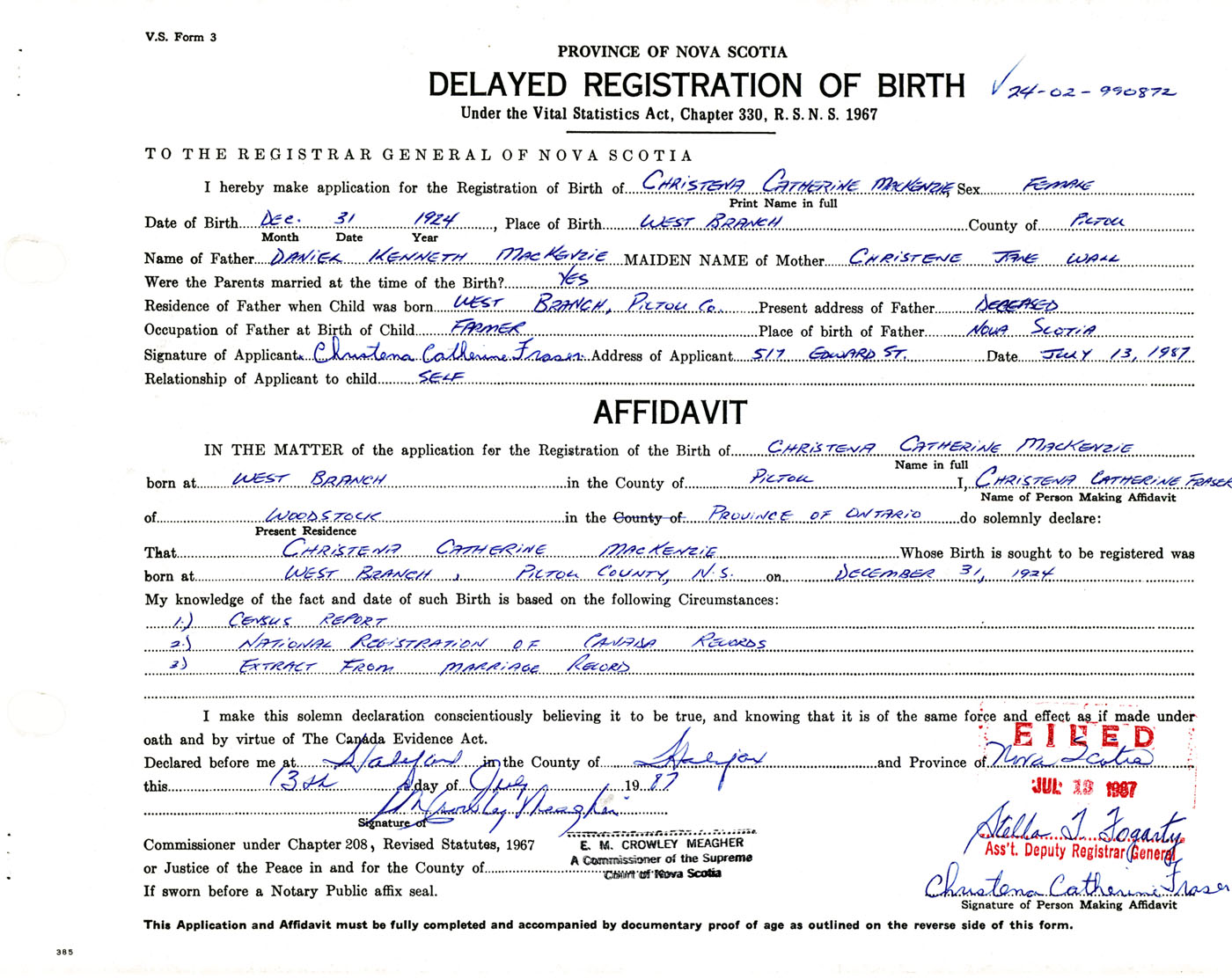 I hereby make application for the Registration of Birth of Christena CatherineMacKenzie Sex Female