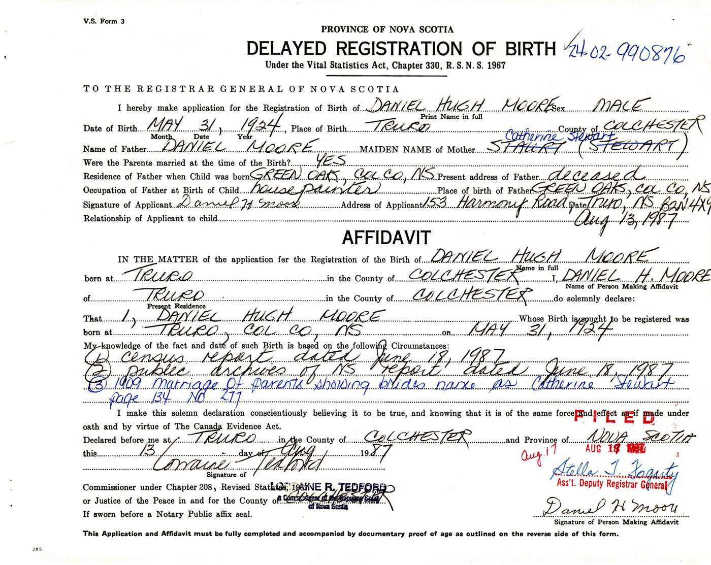 14. (1) Census report dated June 18, 1987 (2) Public Archives of NS report dated June 18, 1987 (3) 1909 Marriage of parents showing brides name as Catherine Stewart page 134 no 277