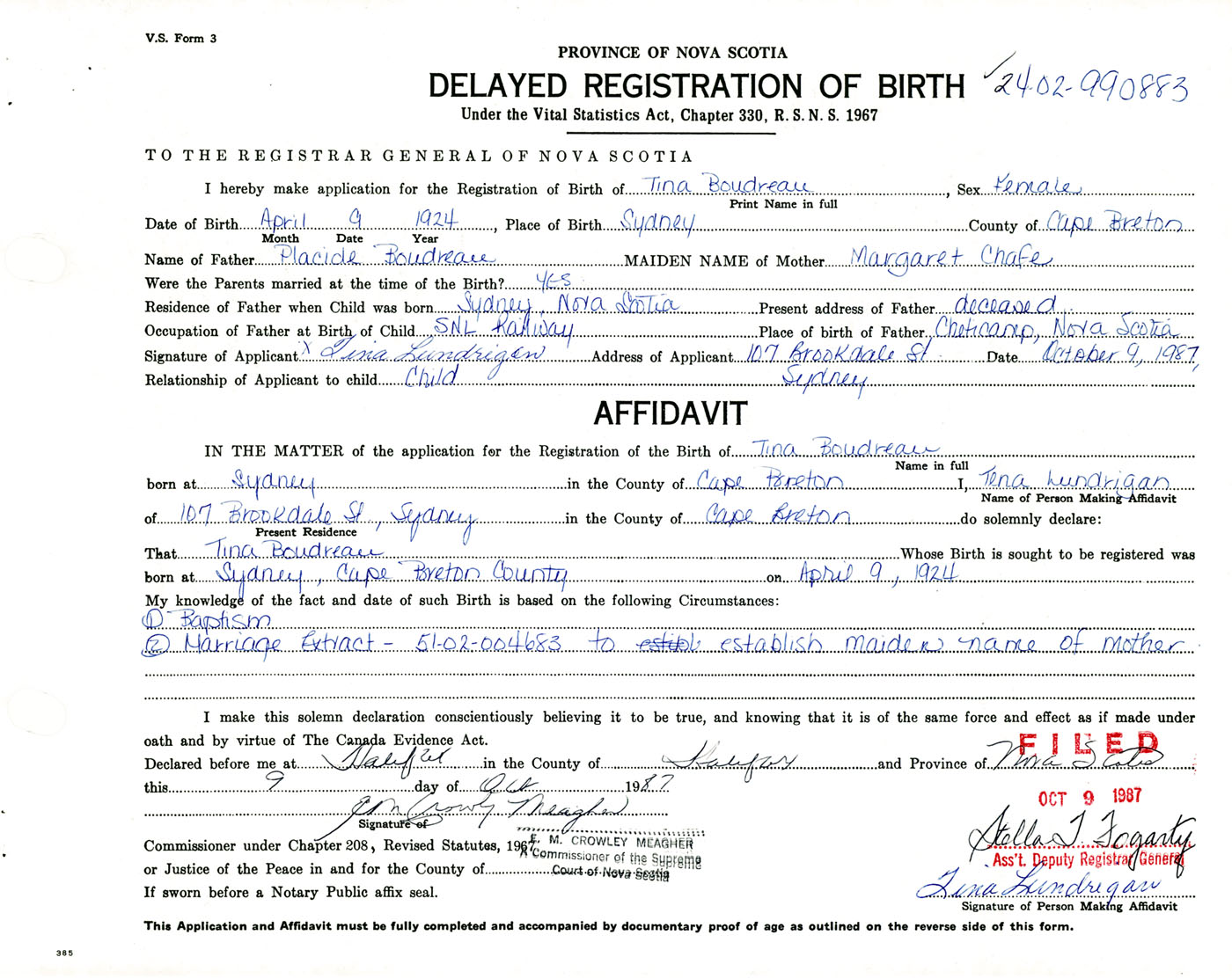 Date of Birth April 9, 1924 Place of Birth SydneyCounty of Cape Breton