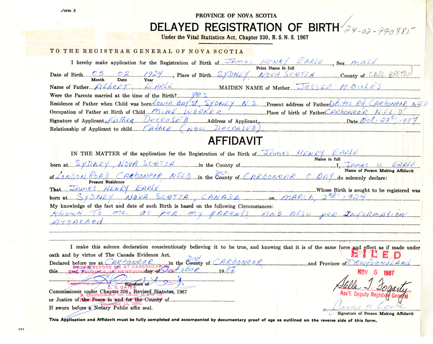 I hereby make application for the Registration of Birth of James HenryEarle Sex Male
