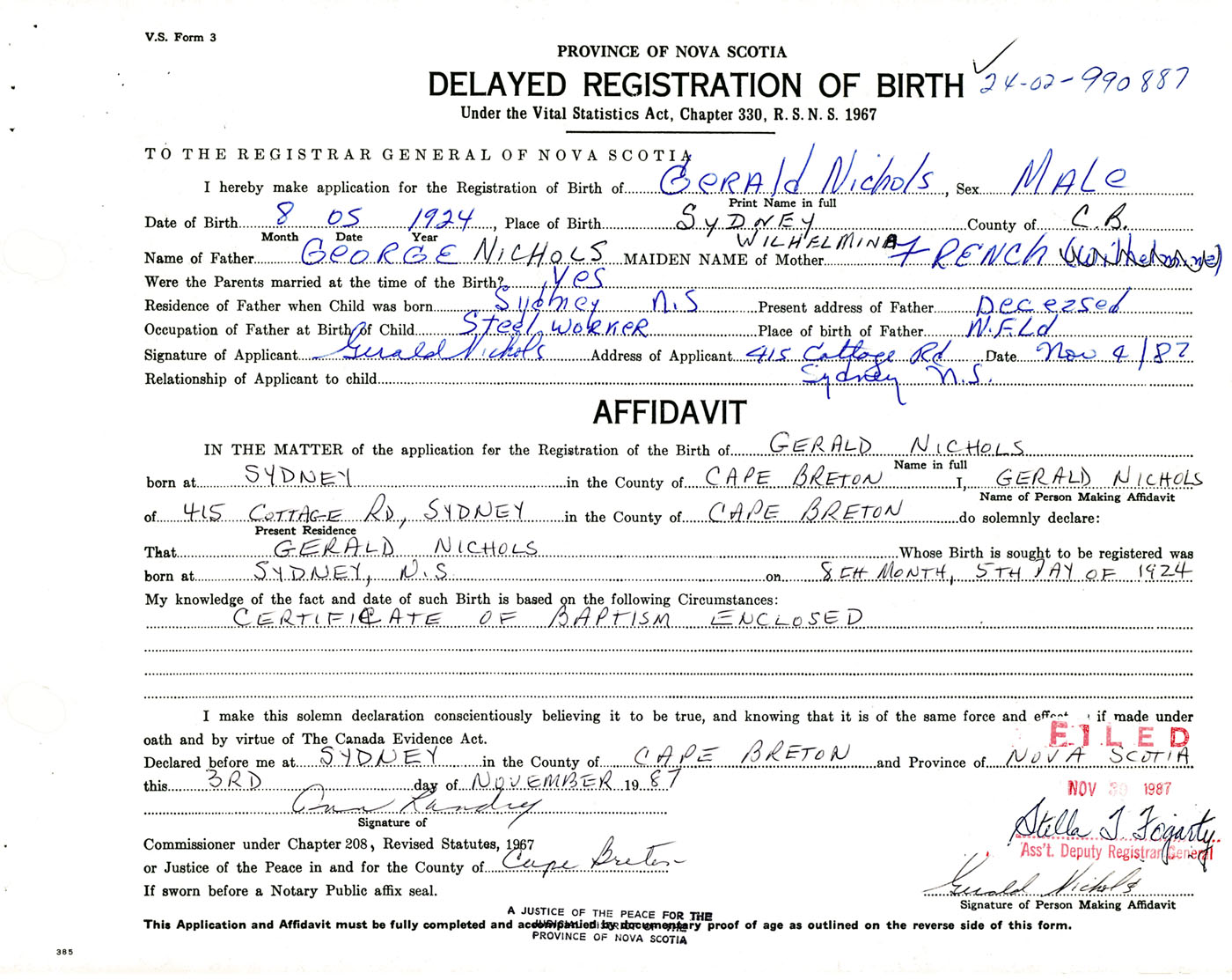 Male Birth Registration: Year: 1924 number: 99000887