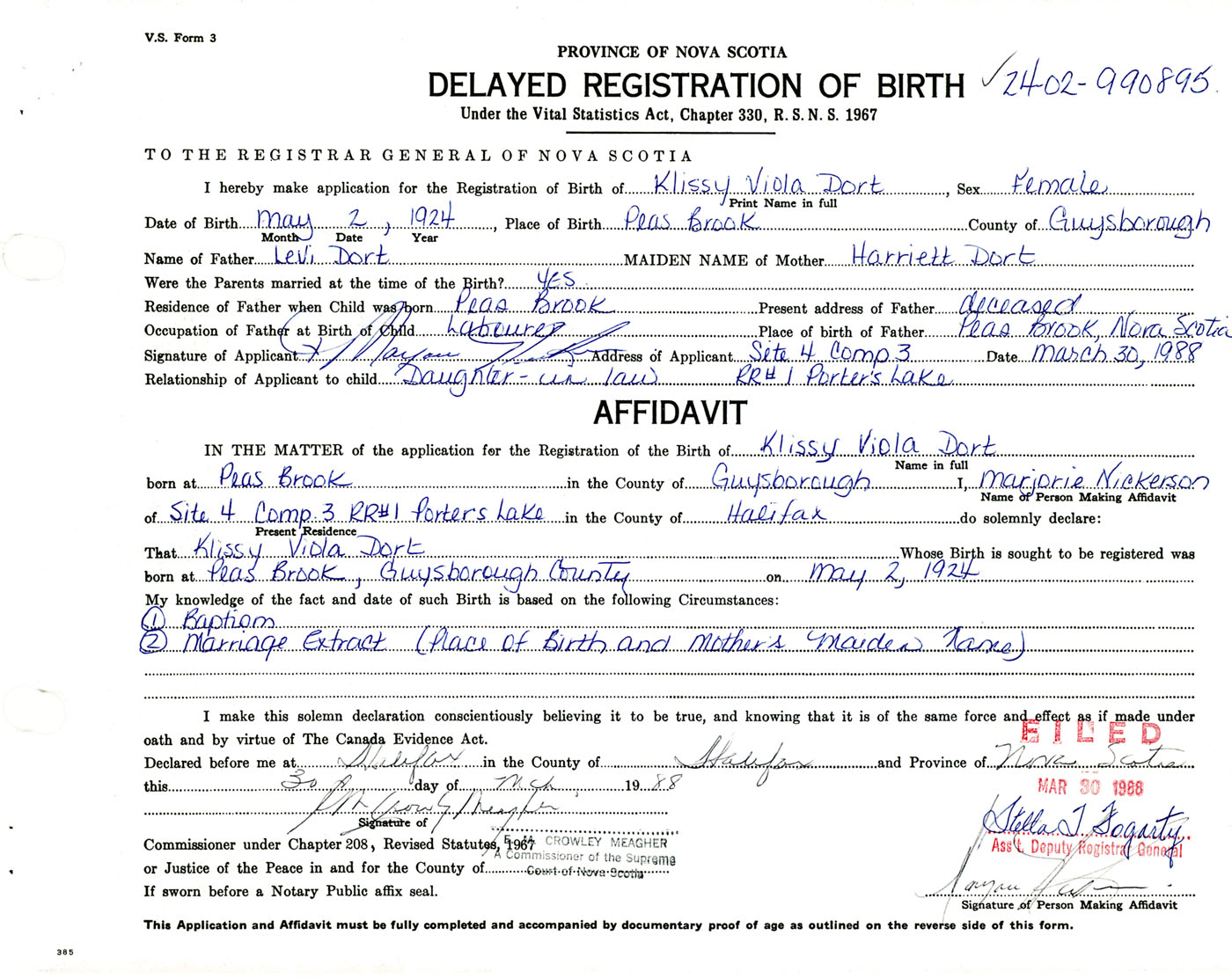 Date of Birth May 2, 1924 Place of Birth Peas BrookCounty of Guysborough
