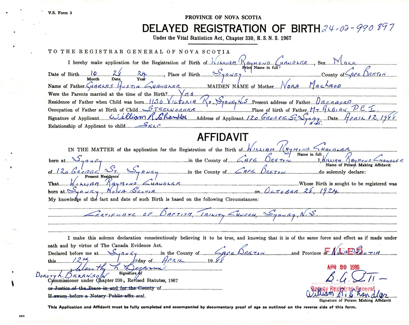 I hereby make application for the Registration of Birth of William RaymondChandler Sex Male