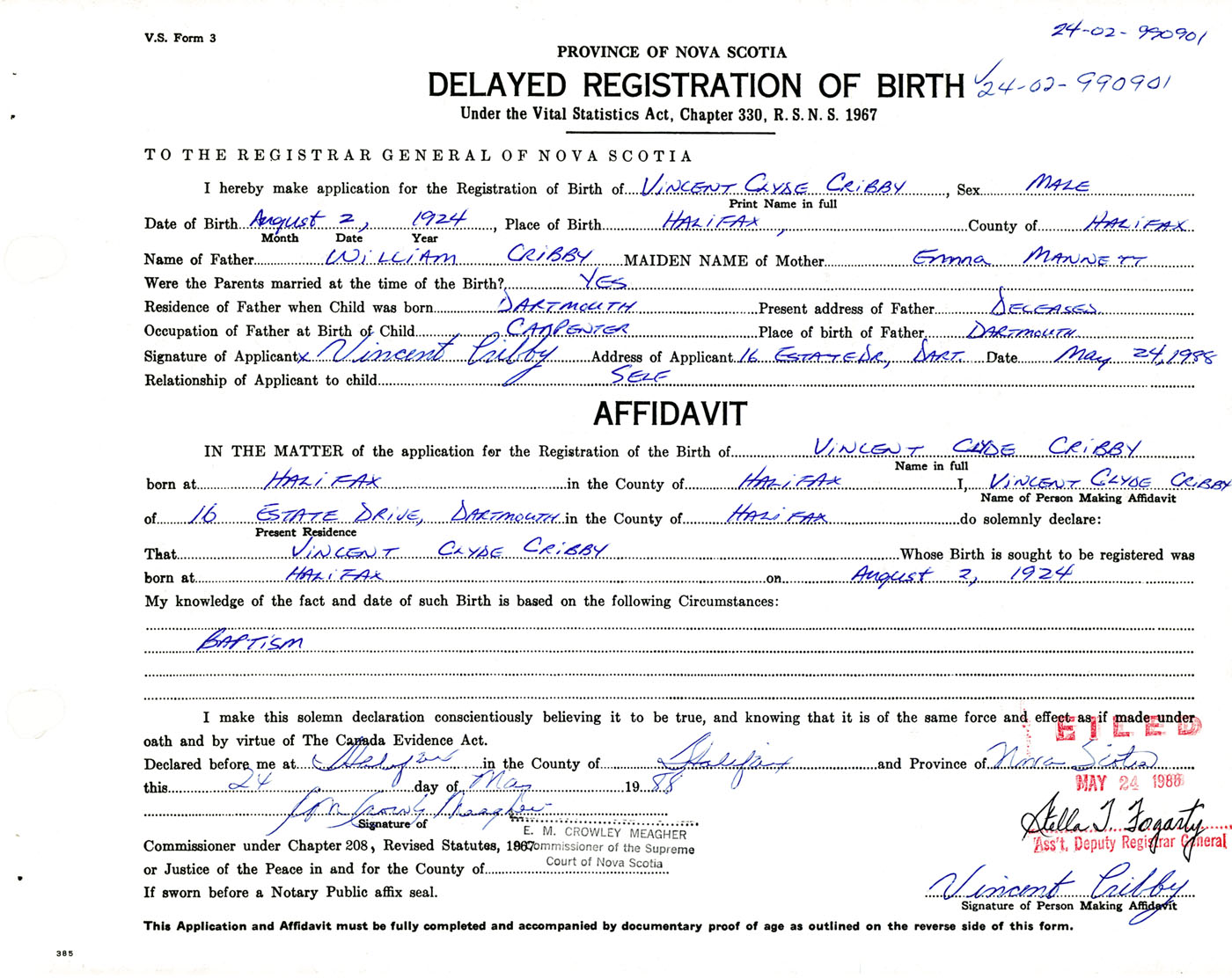 I hereby make application for the Registration of Birth of Vincent ClydeCribby Sex Male