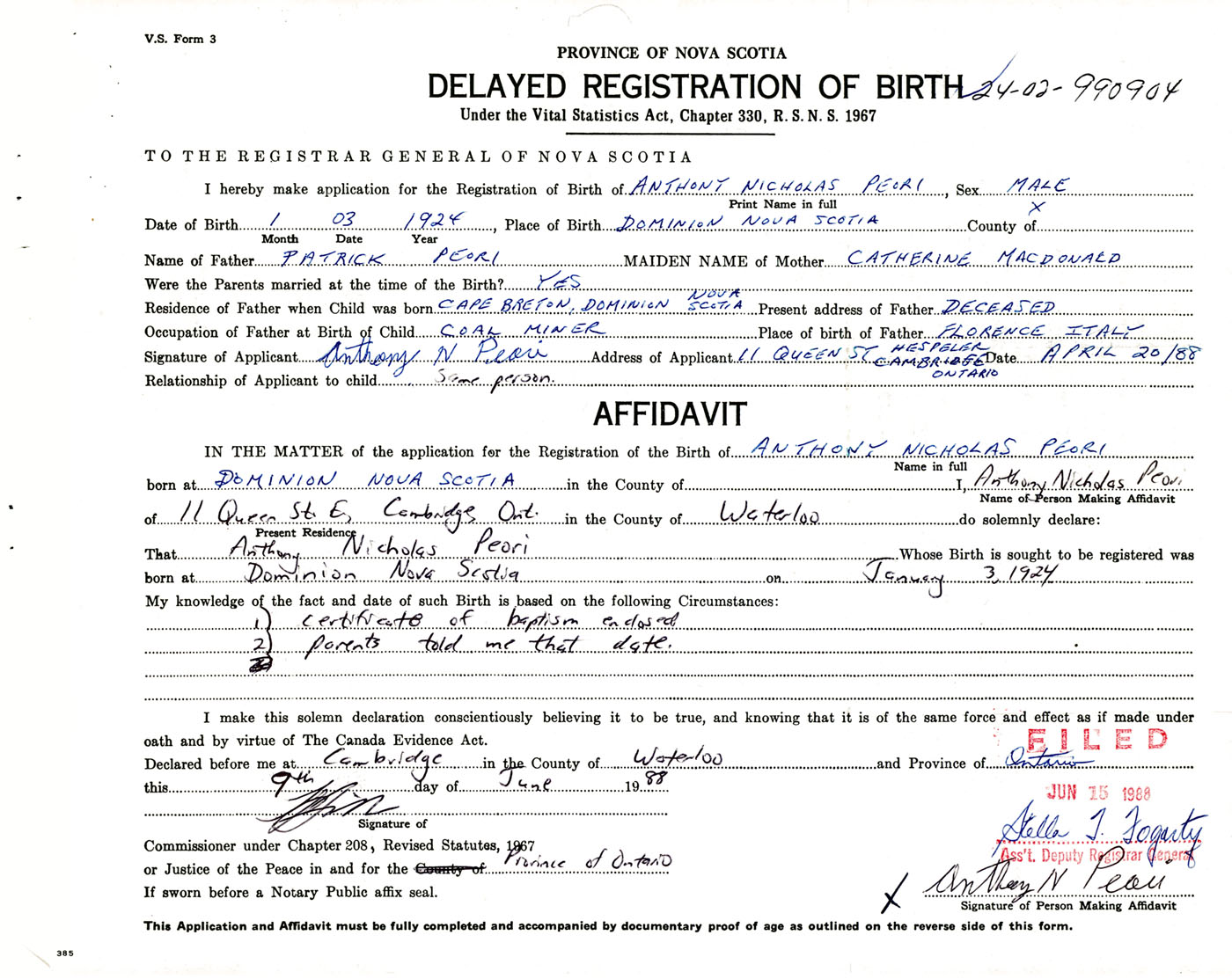 I hereby make application for the Registration of Birth of Anthony NicholasPeori Sex Male