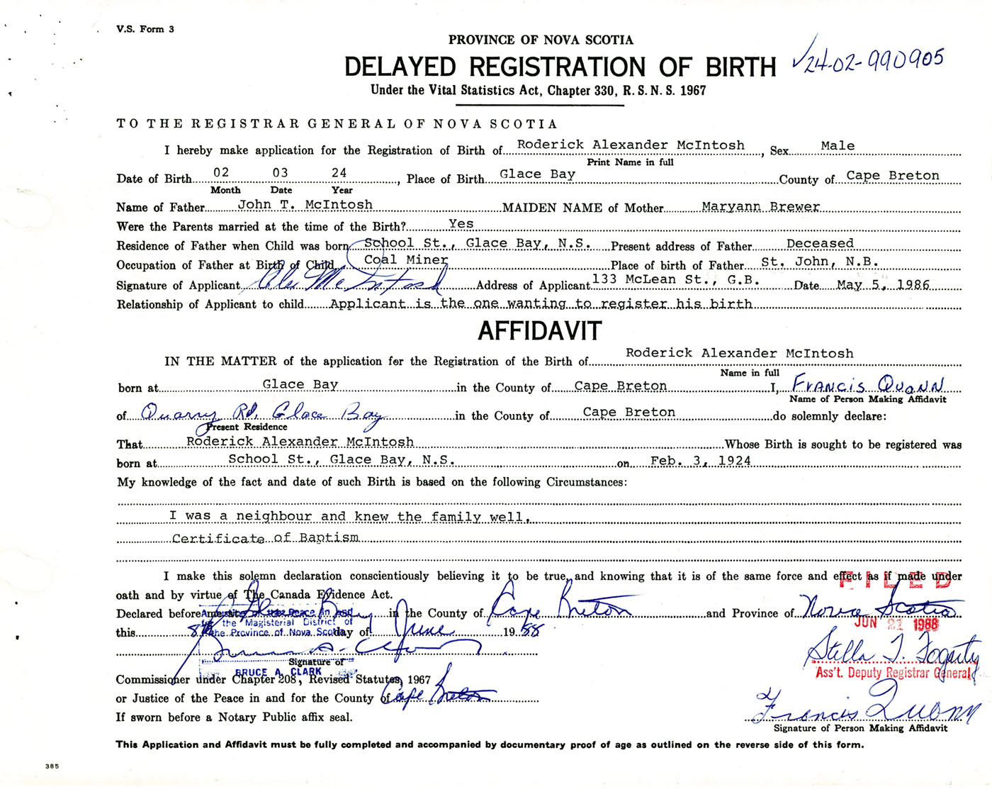 Signature of Applicant Alex McIntosh Address of Applicant 133 McLean St. Glace Bay Date May 5, 1986
