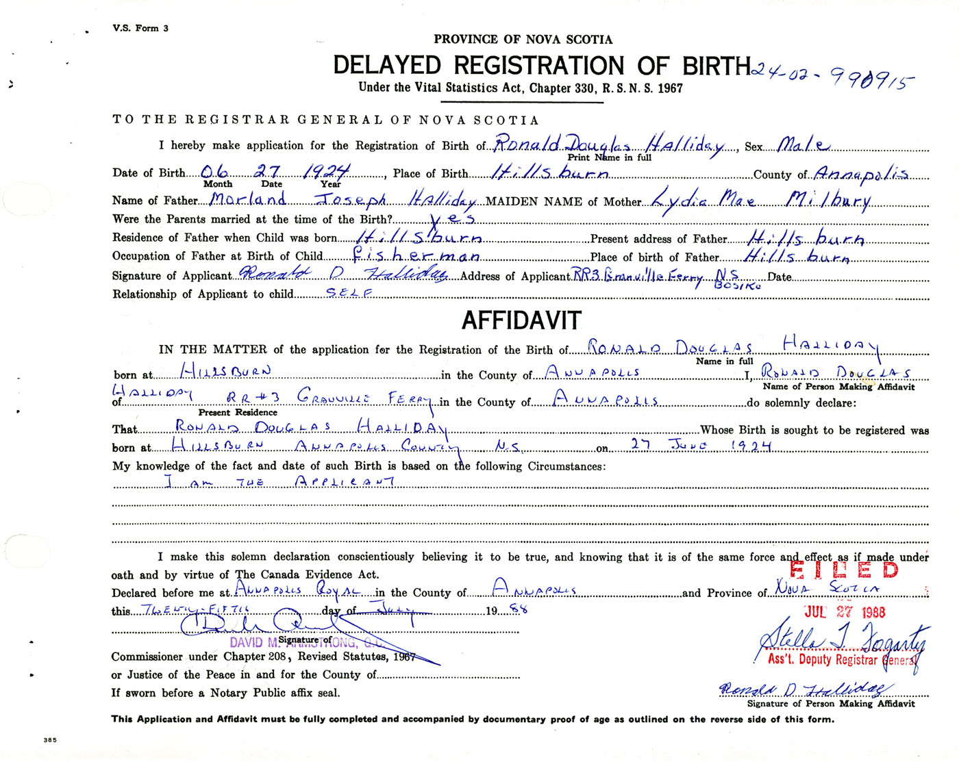 IN THE MATTER of the application for the Registration of the Birth of Ronald DouglasHalliday
