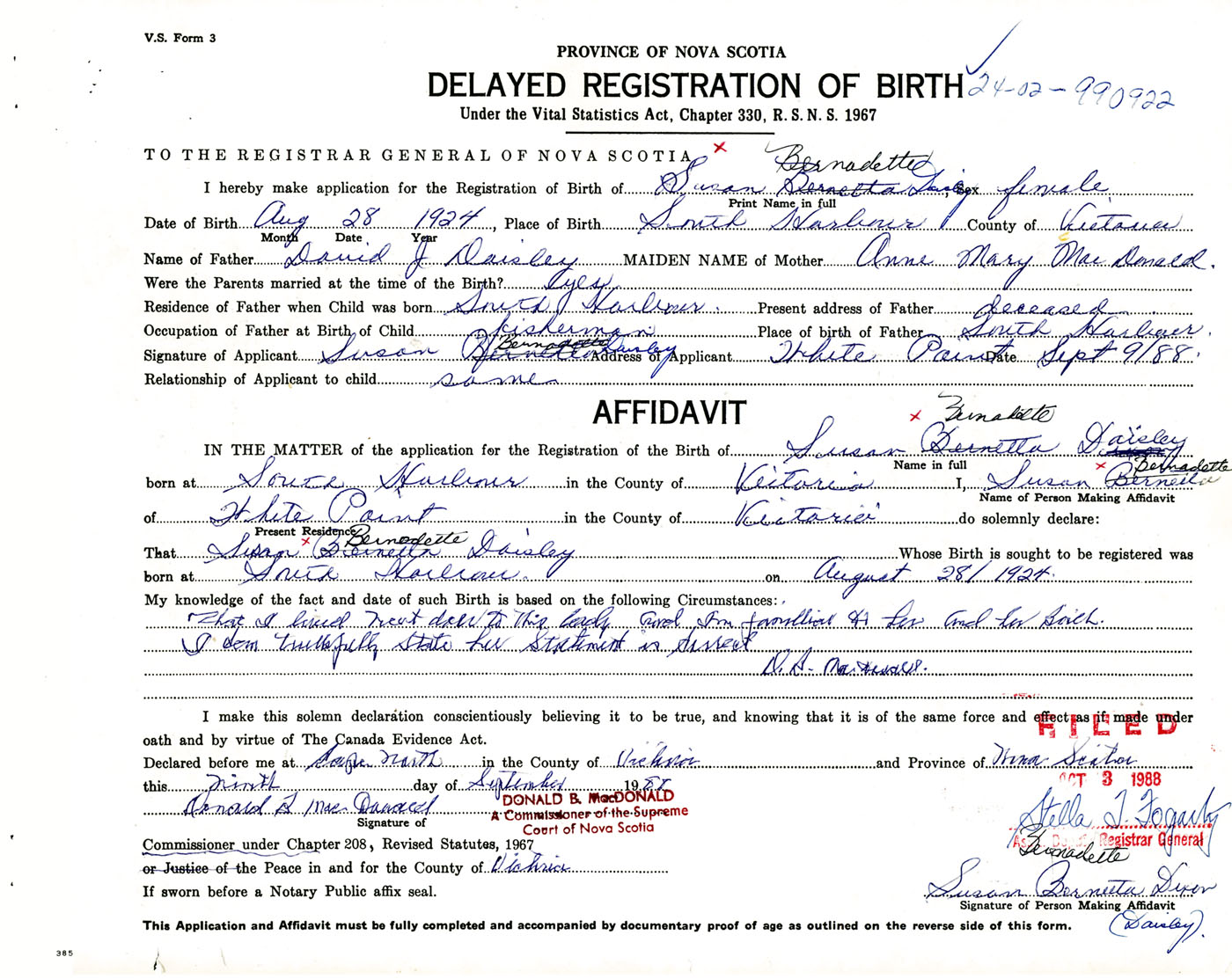 Signature of Applicant Susan Bernadette Daisley Address of Applicant White Point Date September 9, 1988