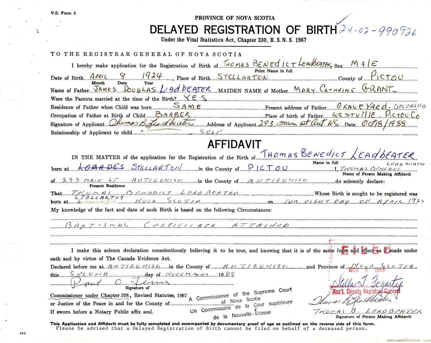 Signature of Applicant Thomas B. Leadbeater Address of Applicant 293 Main St. Antigonish Date October 18, 1988