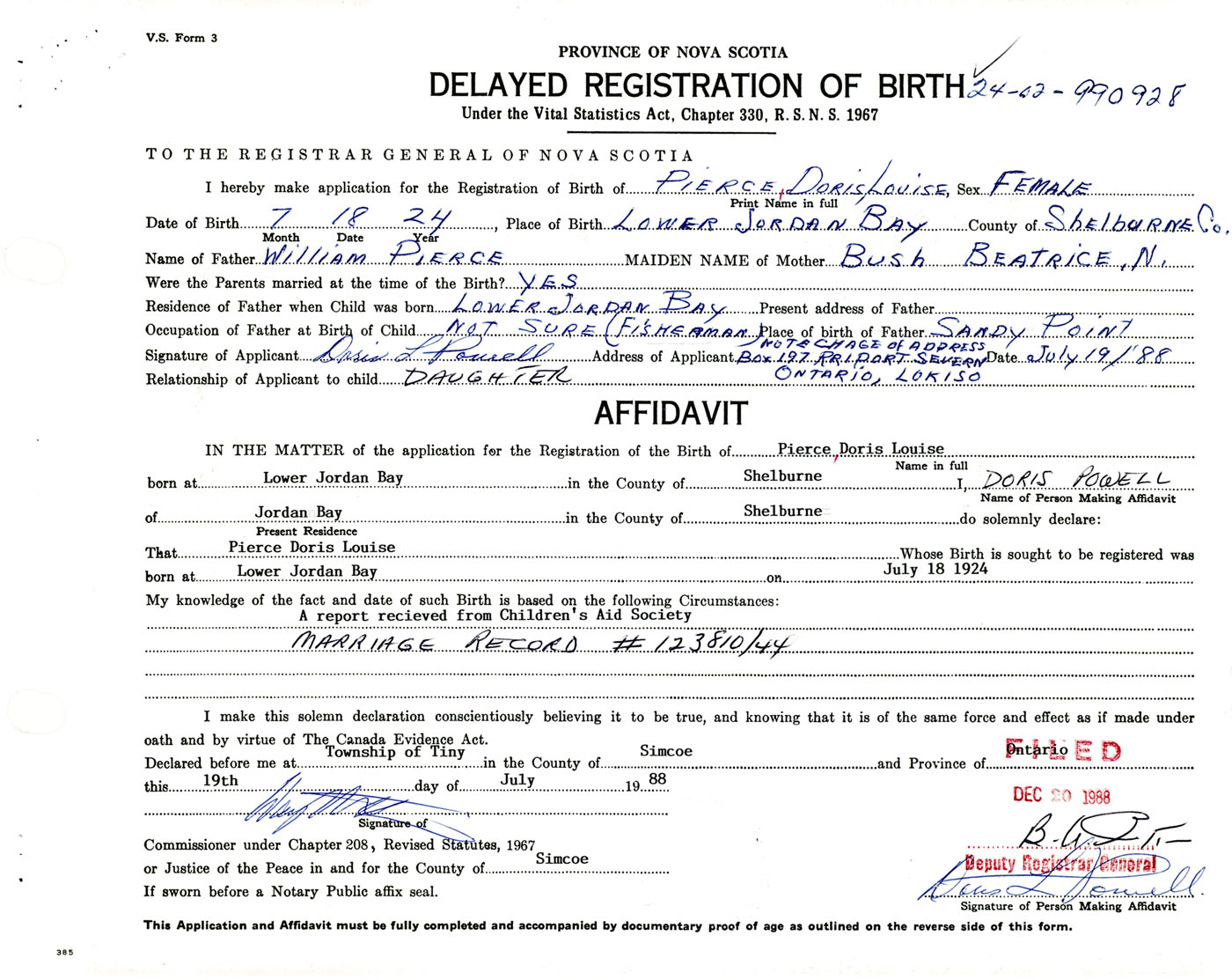 Date of Birth July 18, 1924 Place of Birth Lower Jordan BayCounty of Shelburne