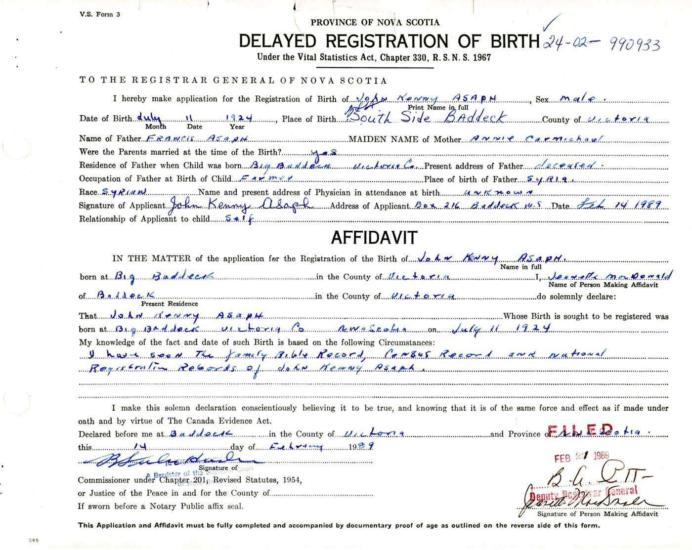 Signature of Applicant John Kenny Asaph Address of Applicant Baddeck Date February 14, 1989