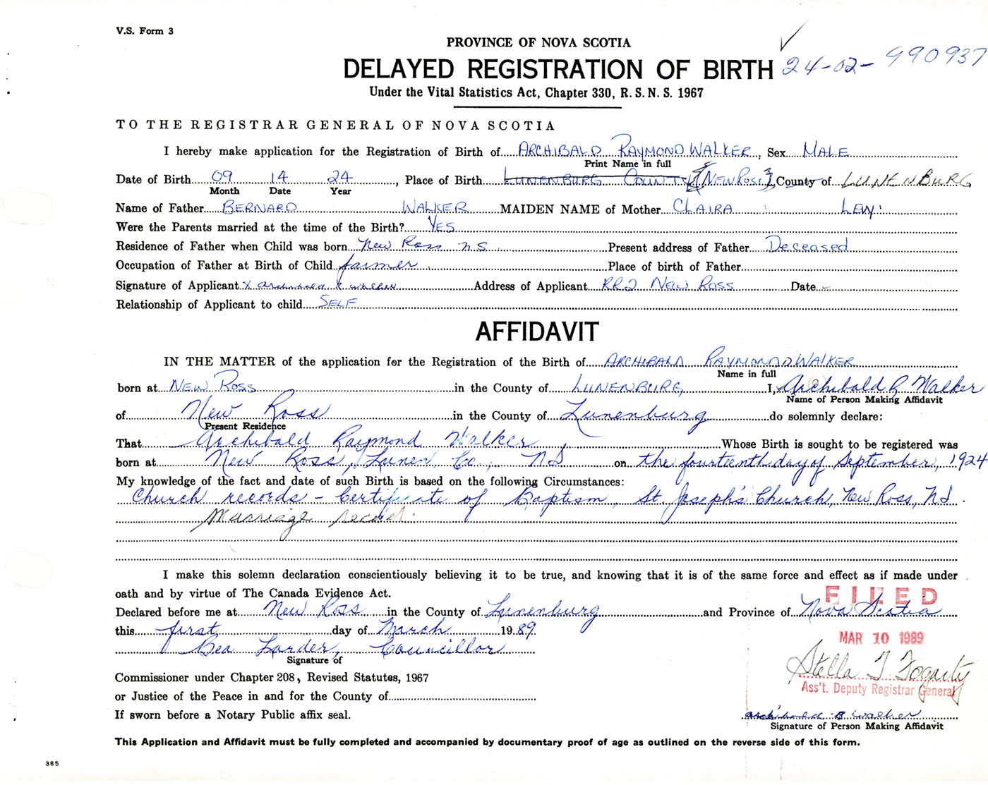 I hereby make application for the Registration of Birth of Archibald RaymondWalker Sex Male