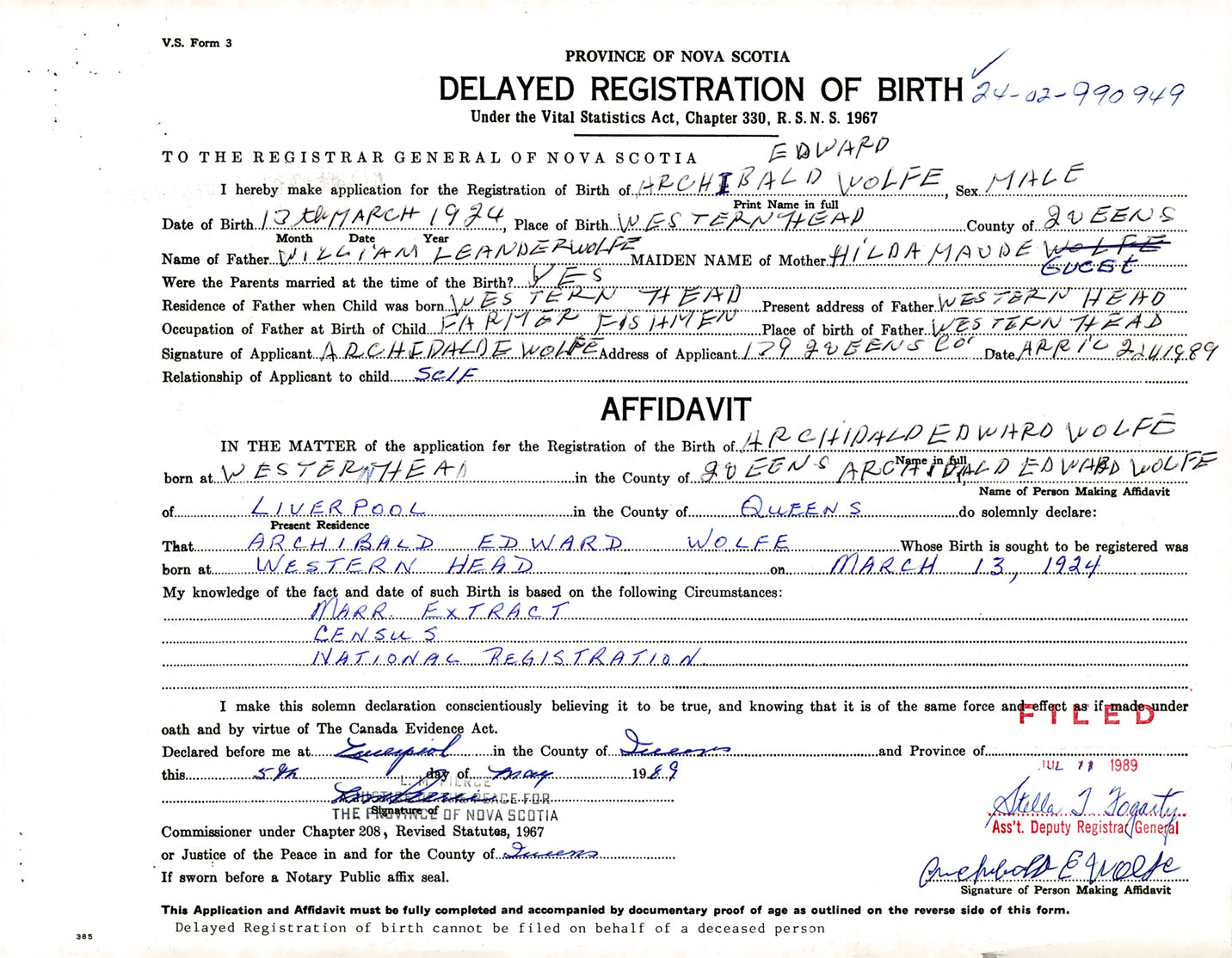 I hereby make application for the Registration of Birth of Archibald EdwardWolfe Sex Male