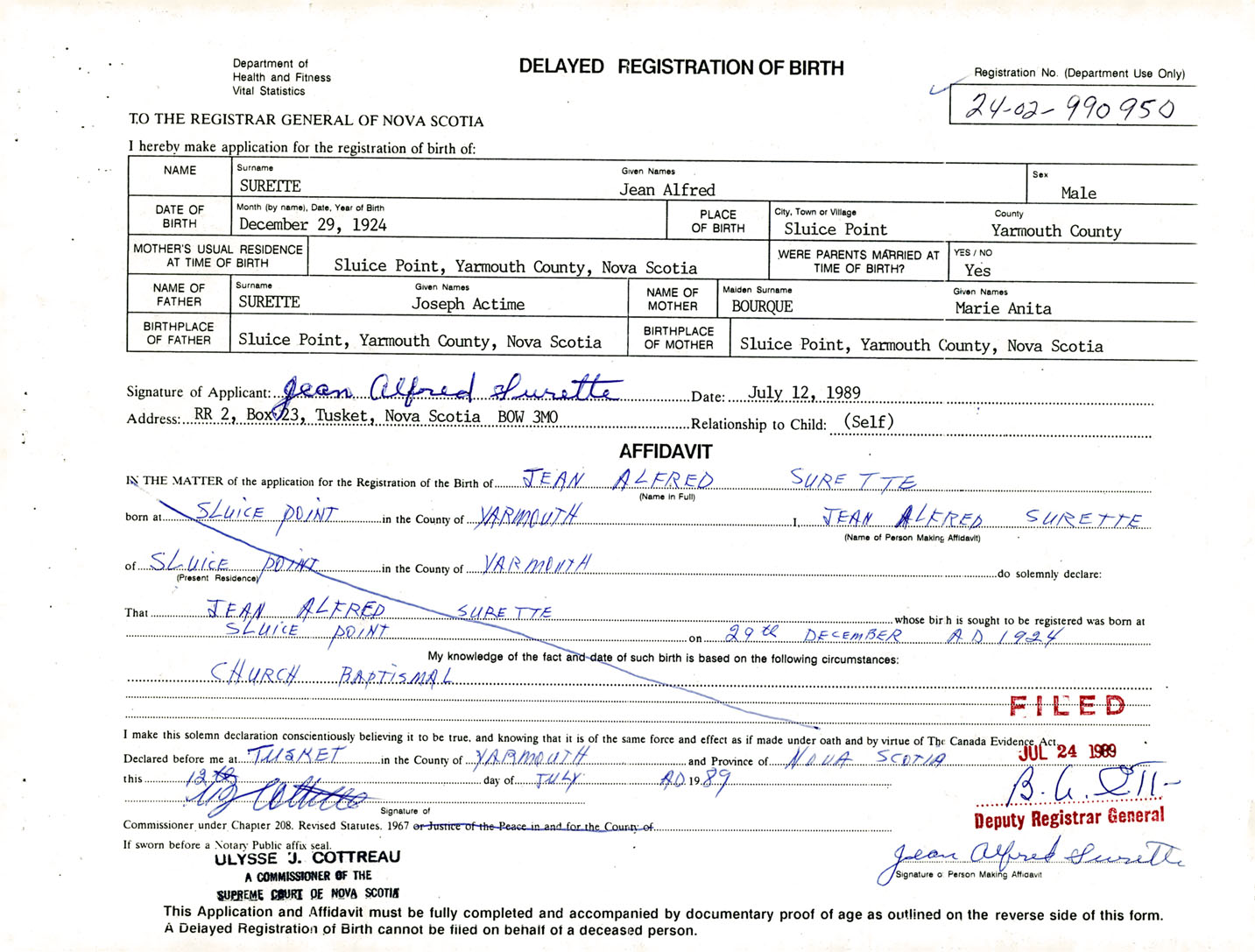 Signature of Applicant Jean Alfred Surette Address of Applicant Tusket Date July 12, 1989