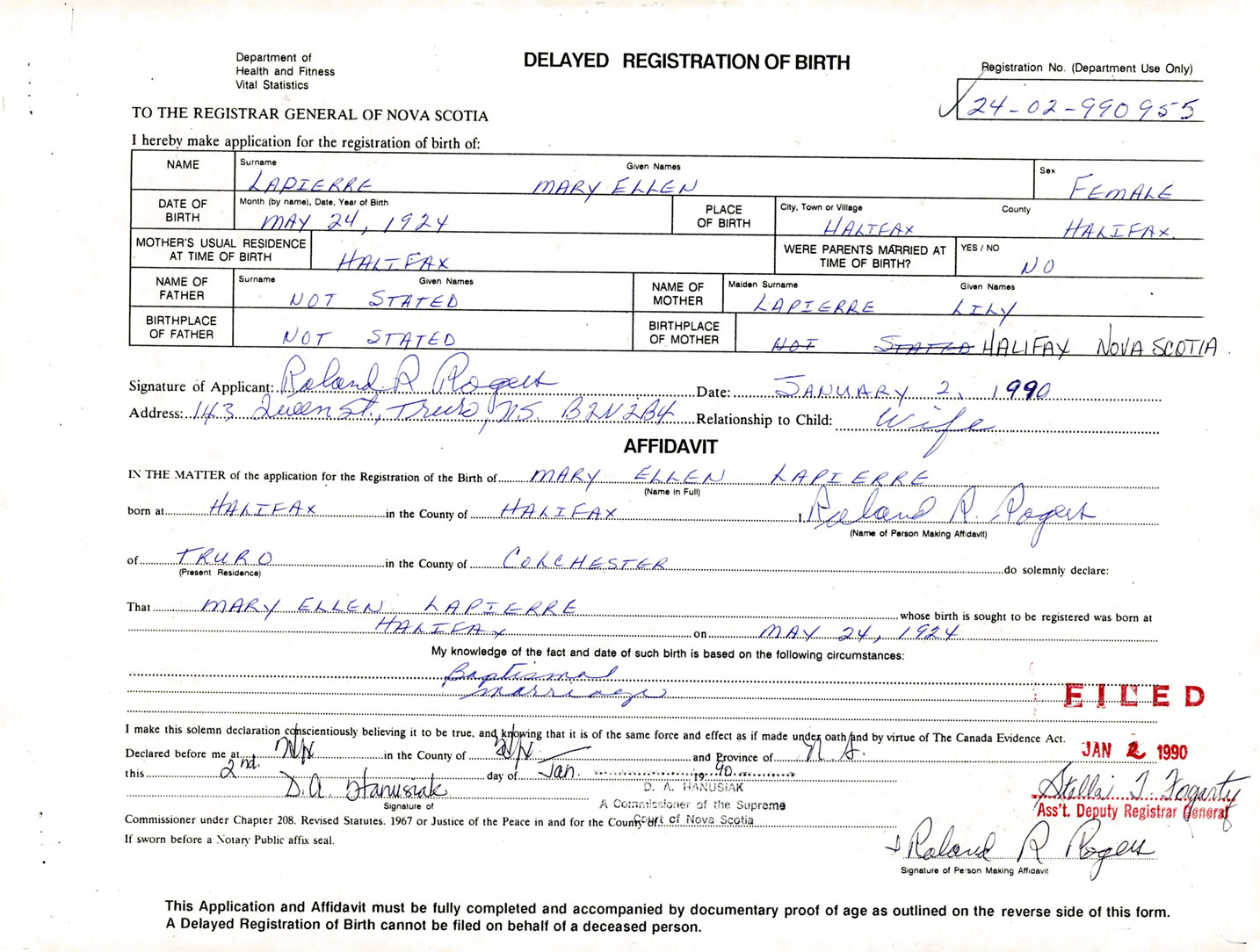 I hereby make application for the Registration of Birth of Mary EllenLaPierre Sex Female