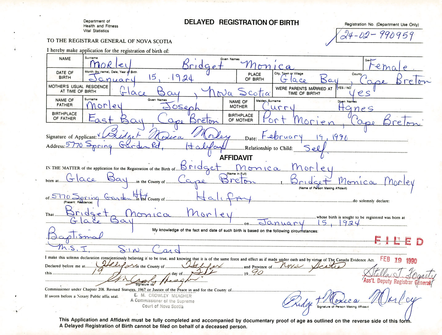 Signature of Applicant Bridget Monica Morley Address of Applicant 5770 Spring Garden Rd. Halifax Date February 19, 1990