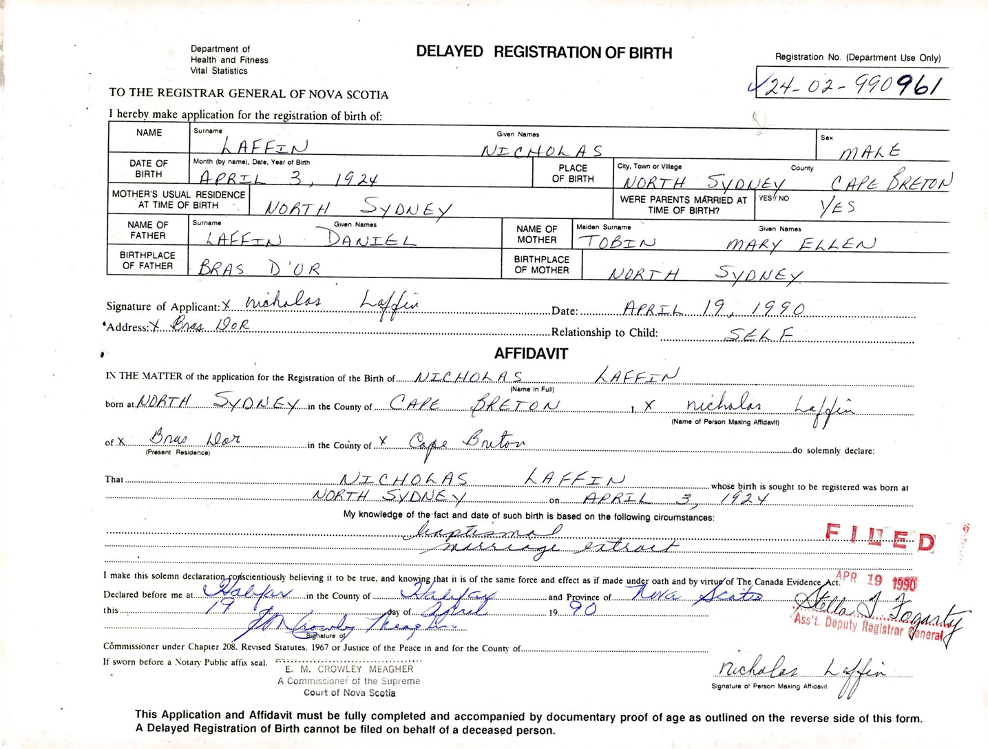 Signature of Applicant Nicholas Laffin Address of Applicant Bras d'Or Date April 19, 1990
