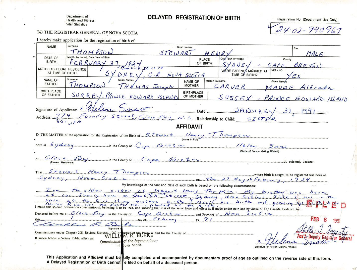 I am the older sister of Stewart Henry Thompson. My brother was born at our family home on Benetick St. Sydney, Nova Scotia. Since I was in the house at the time of my brothers birth I recall his birth and growing up with him. Doctor Rice was the doctor who attended at the birth.