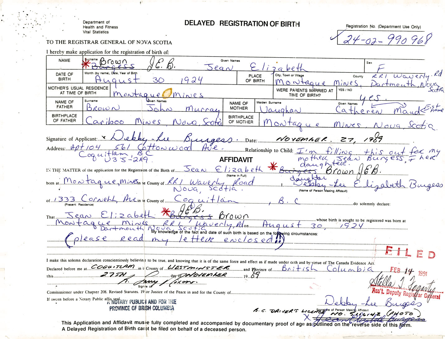 Signature of Applicant Debby Lee Burgess Address of Applicant 561 Cottonwood Ave. Coquitlam, British Columbia Date November 27, 1989