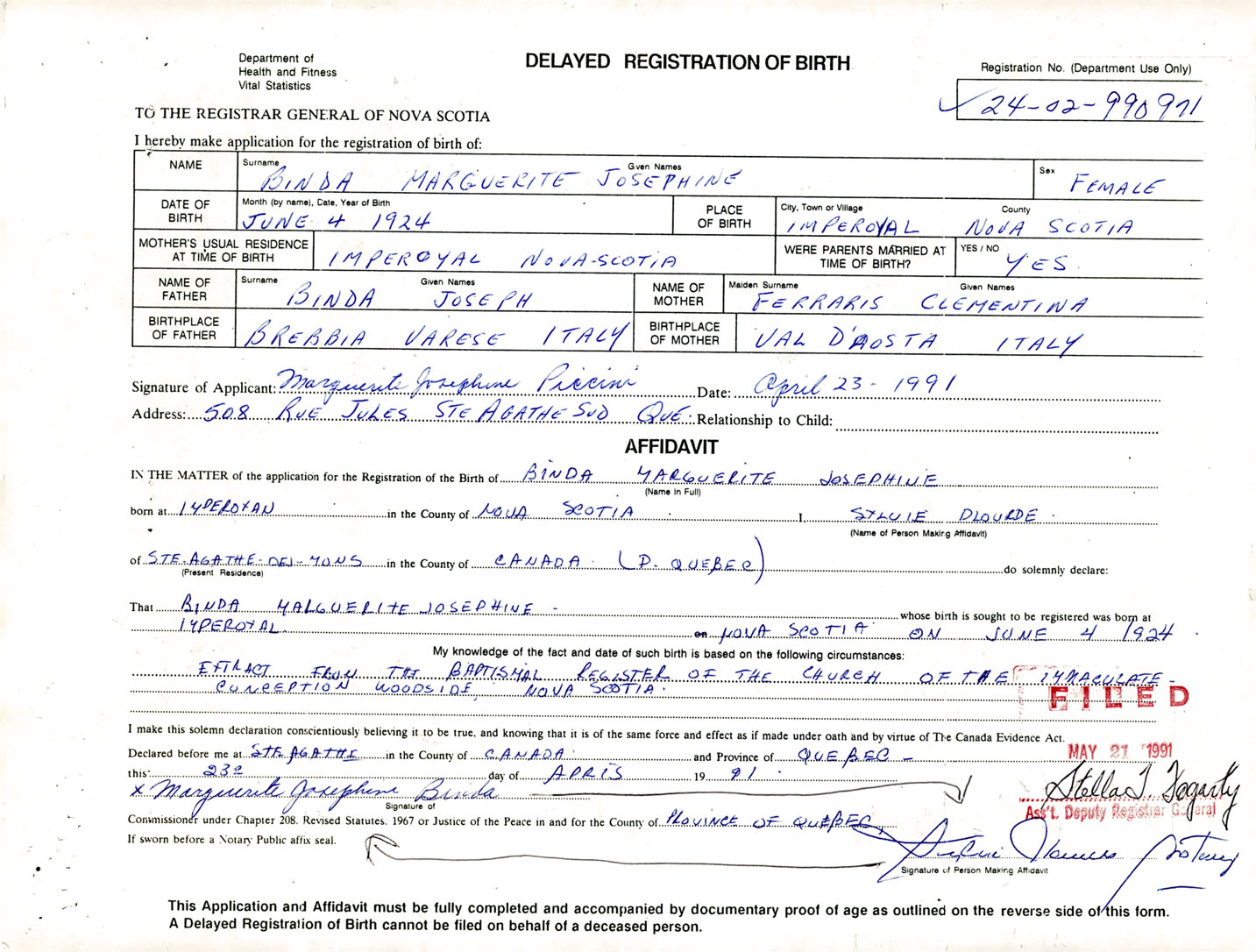 14. Extract from the Baptismal Register of the Church of the Immaculate Conception Woodside, Nova Scotia.