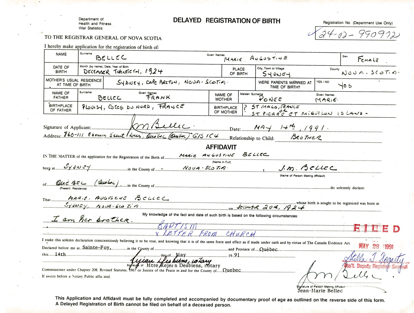 I hereby make application for the Registration of Birth of Marie AugustineBellec Sex Female