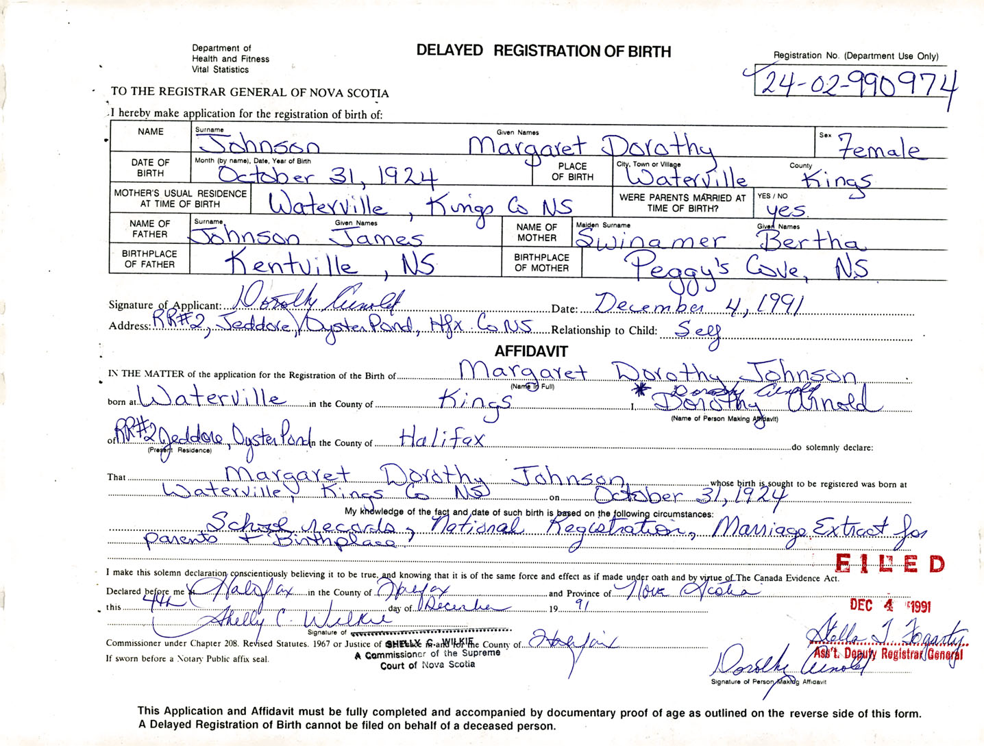 I hereby make application for the Registration of Birth of Margaret DorothyJohnson Sex Female