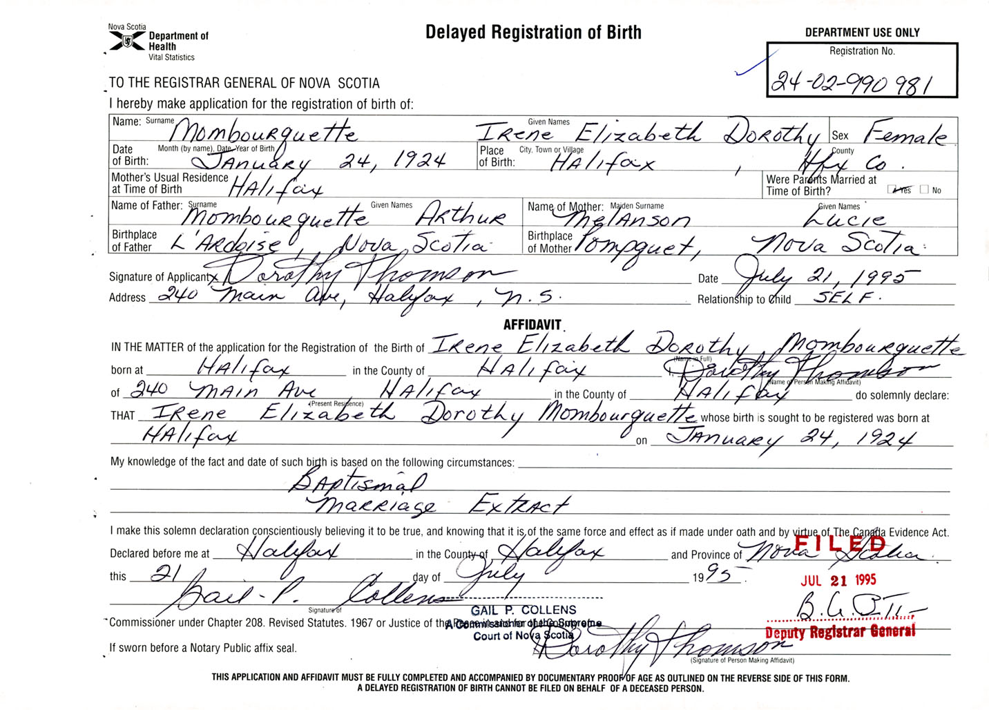 Signature of Applicant Irene Elizabeth Dorothy Mombourquette Address of Applicant 240 Main Ave. Halifax Date July 21, 1995