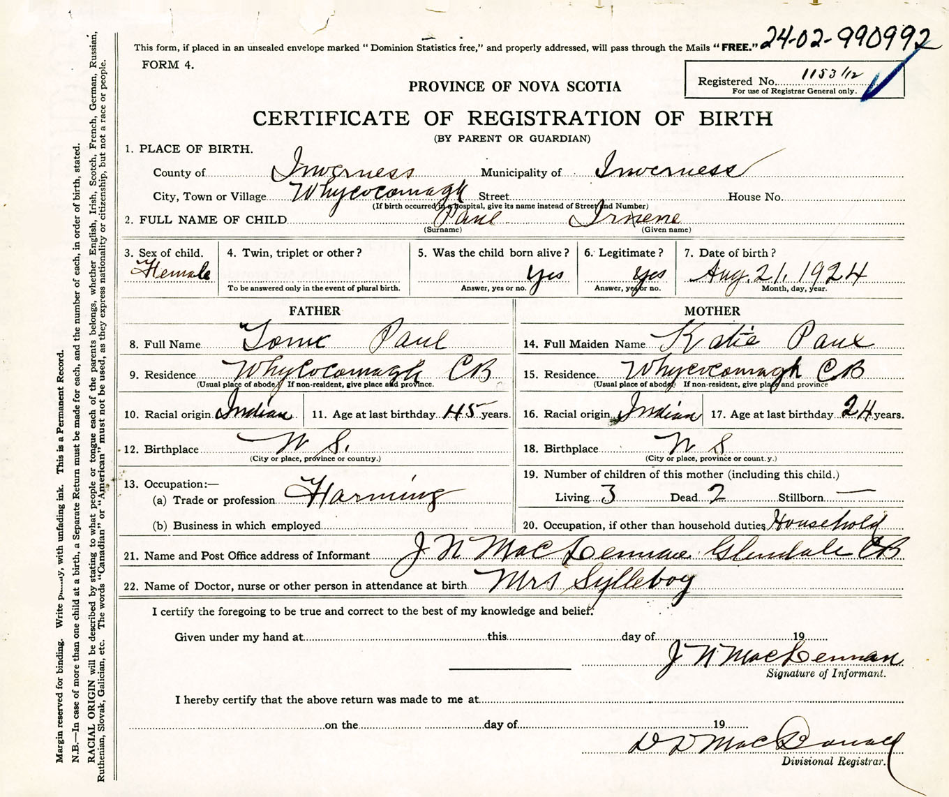 Female Birth Registration: Year: 1924 number: 99000992