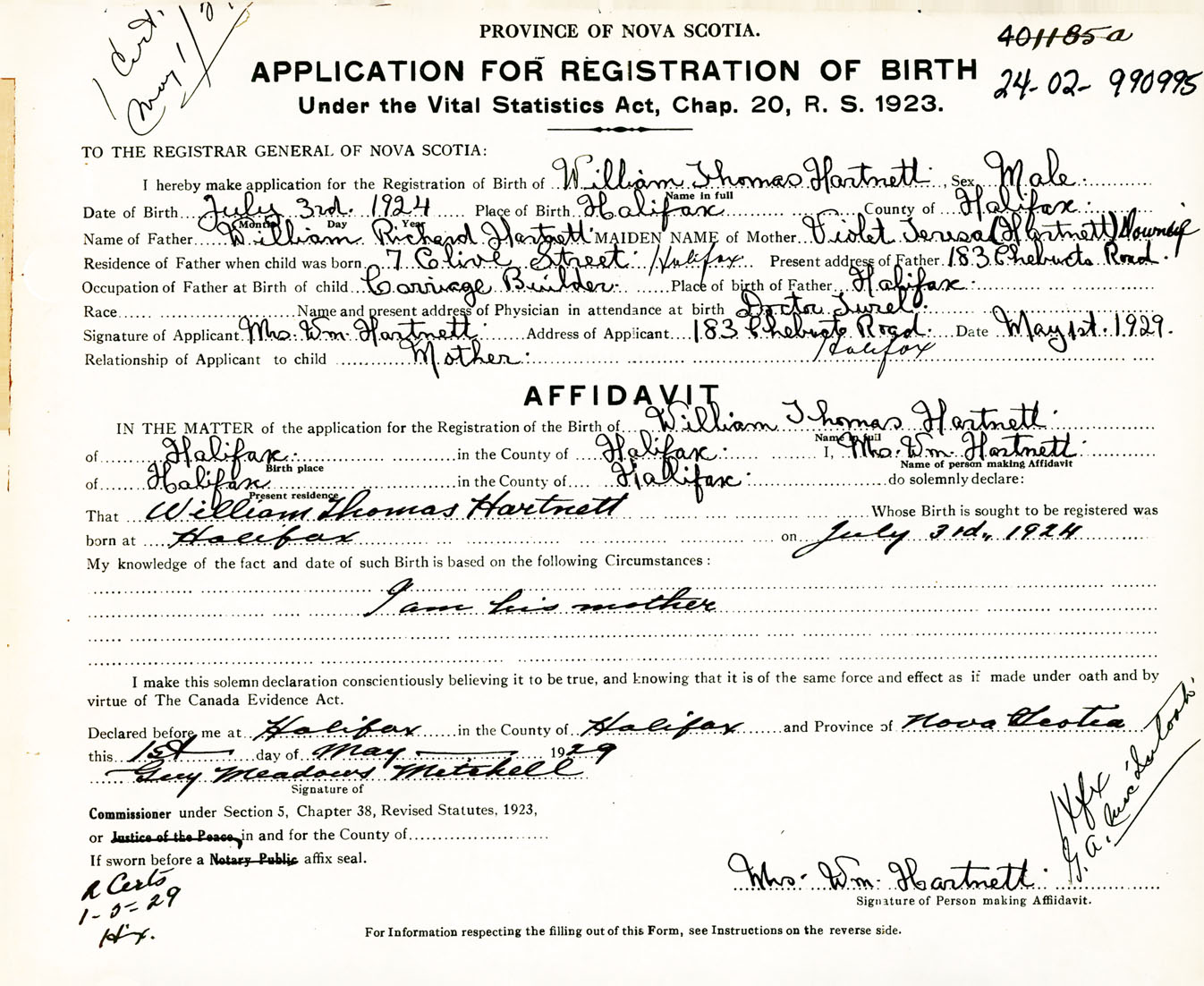 I hereby make application for the Registration of Birth of William ThomasHartnett Sex Male
