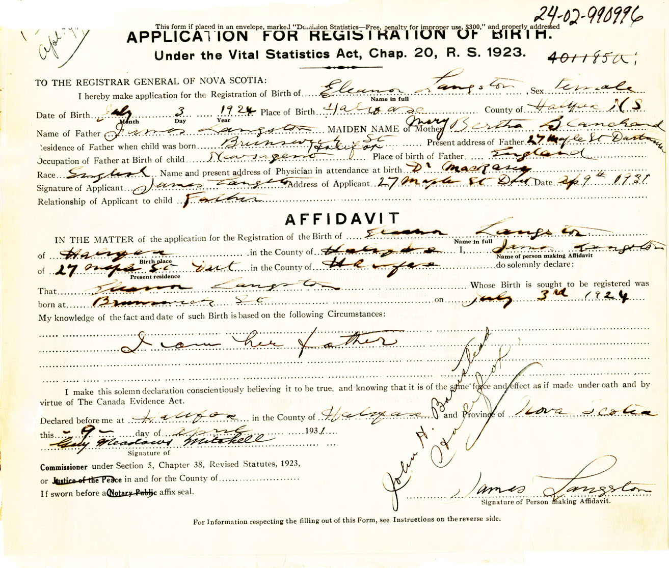 I hereby make application for the Registration of Birth of EleanorLangston Sex Female