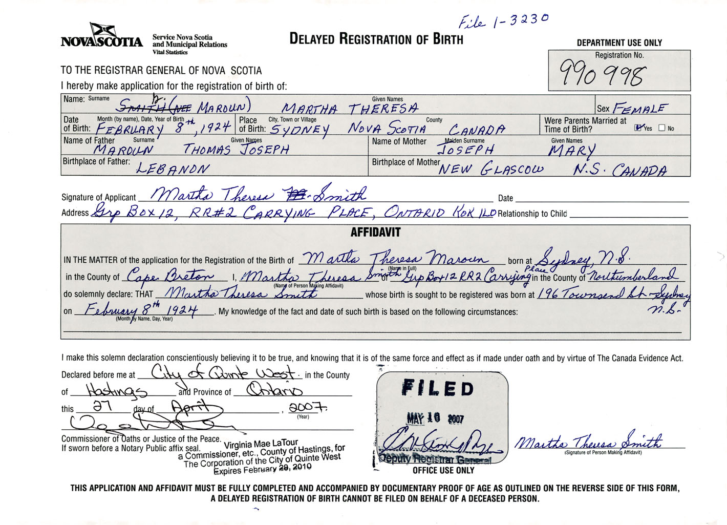 Female Birth Registration: Year: 1924 number: 99000998
