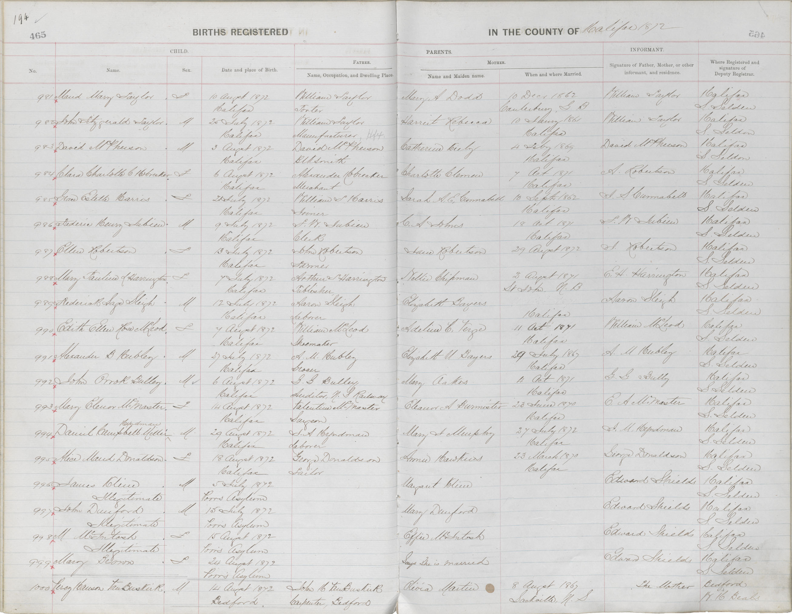 Birth Registration: Year: 1872 book: 1810 page: 194 number: 981