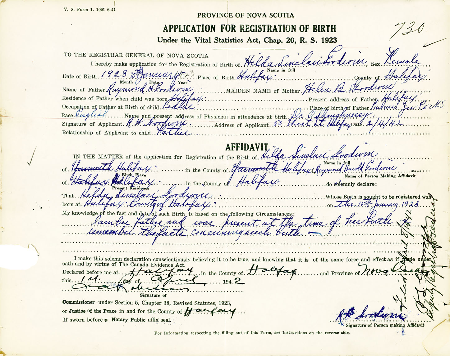 Female Birth Registration: Year: 1923 number: 92000730